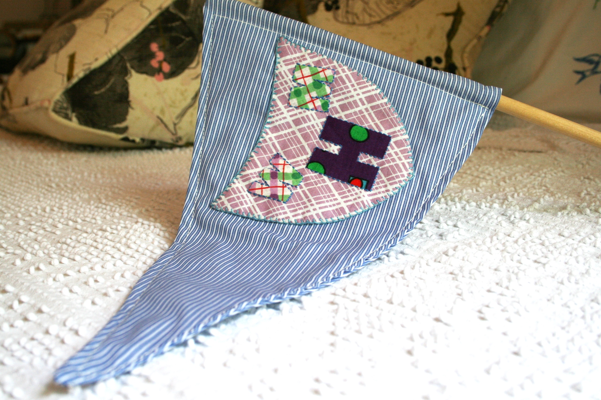 Once the “crest” was attached I sewed the two triangle pieces right sides together with a 1/2 inch seam allowance, leaving a small slit at the back-end of the bottom corner. After trimming the seam allowance, use the slit to turn the flag right side out. I pressed it and then added a topstitch for stability about 1/4 inch in all the way around and up to the pocket left for turning. Stitch a seam about 1/2 inch away from and along the back edge of the flag down to the open slit to create a casing for your dowel. (This step will need to be adjusted according to the size flag you are making.) Just slip the flag over the end of the wooden dowel and you are set done! I did add a little dab of glue along the bottom edge of the slit at the dowel to keep the flag from getting ripped off by my crazy toddler.