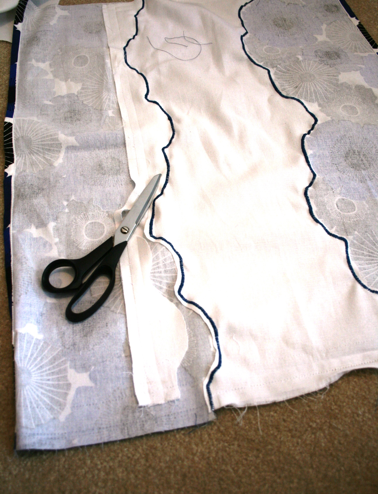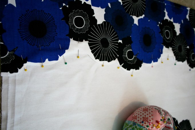 After lining up the cut edge, I pinned it in place. I then used a satin stitch, in contrasting navy blue, that curves with each flower along both sides, to attach the cut edge and add some interest.