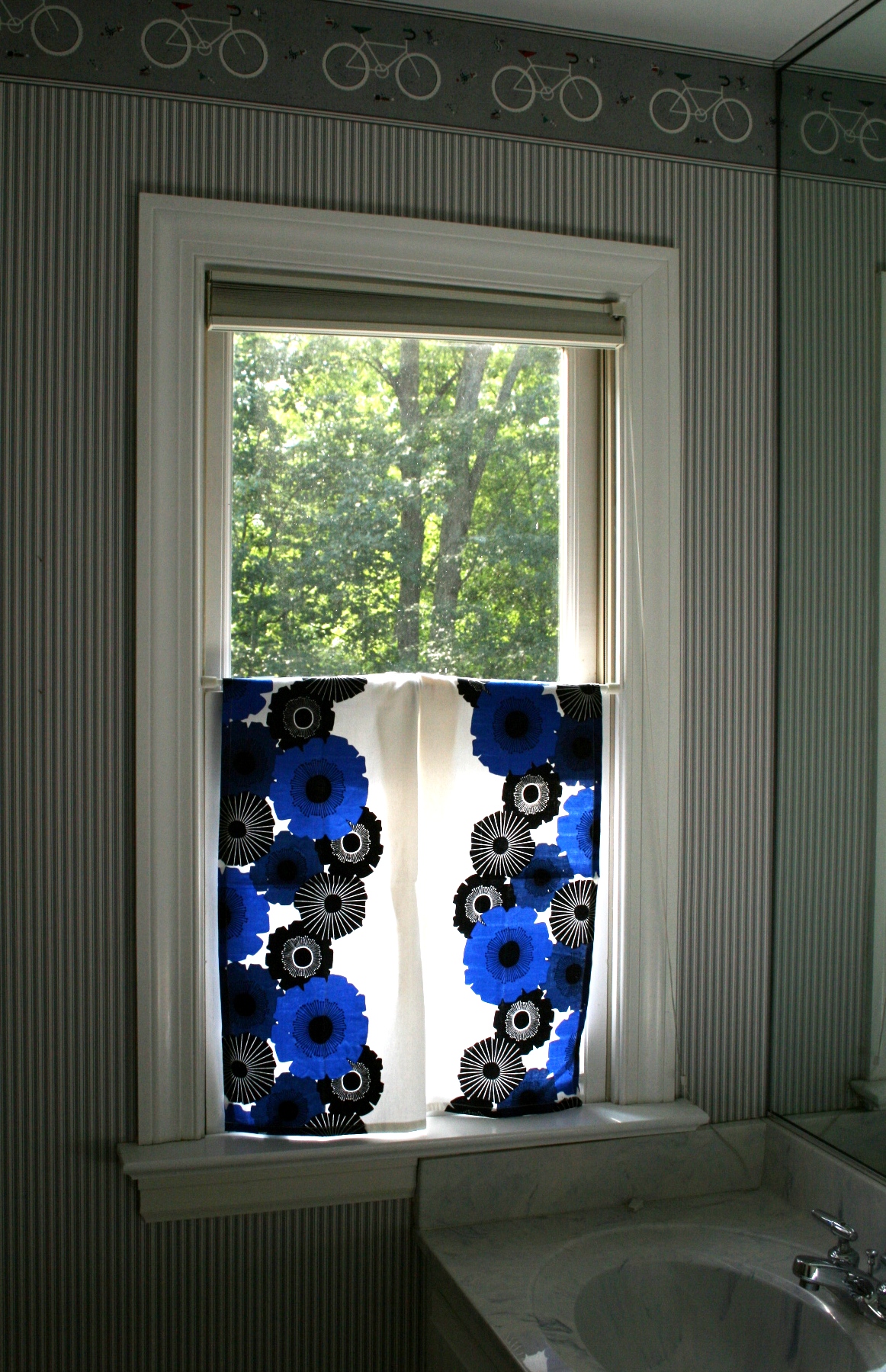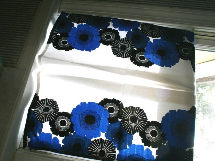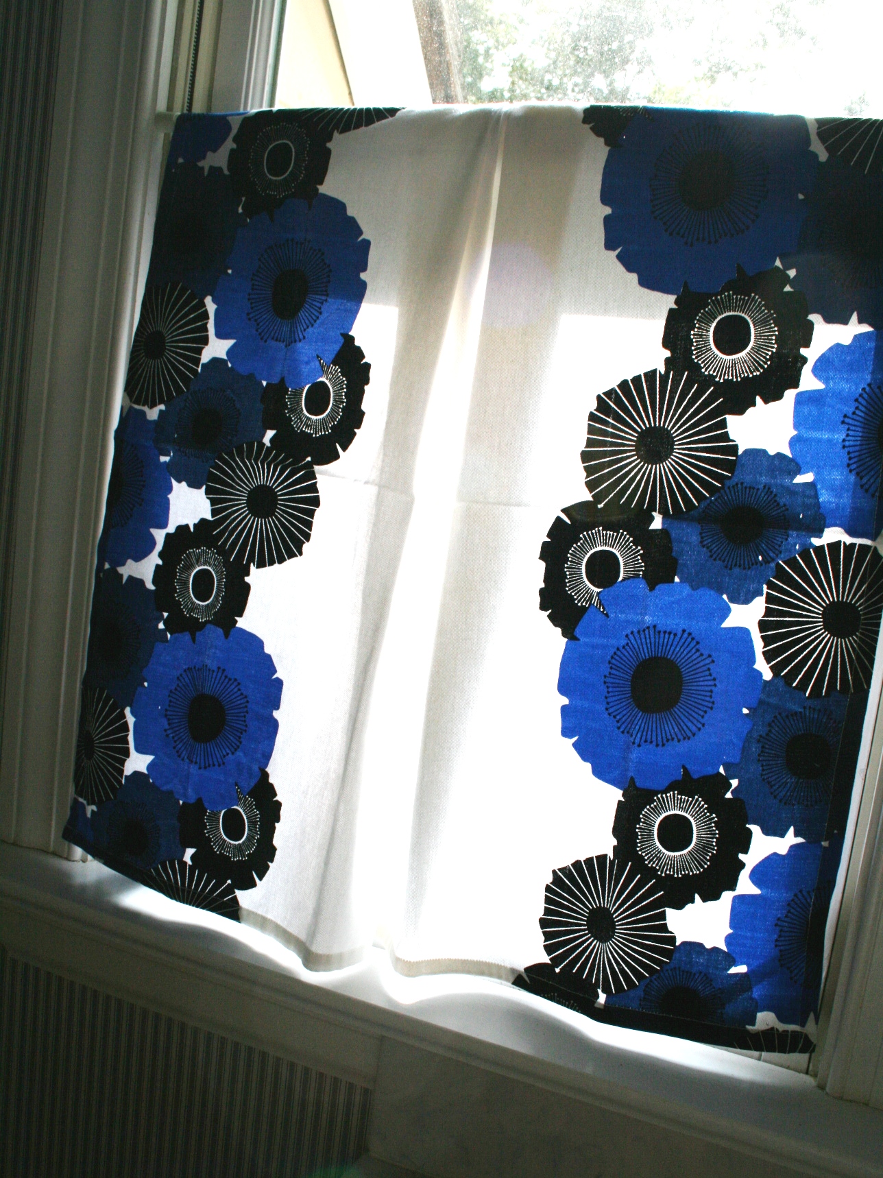 I know they are a total clash with the super cool bicycles, but eventually they will fit right in. I just love the bold, but modern floral pattern and the deep blue, almost black-navy colors. They are very Marimekko, am I right? The pattern runs along just one side of the towel, so I used the tension rod to hold them in place while I played around with how to hang them. I liked the idea of the white being in the middle to let in the most light, but since I would need two towels to cover the window that would result in a seam right down the middle. Not really wanting to see that every day, I tried to make a pleat to hide the seam and add some interest. It was okay, but I thought that even the pleats were hiding too much light.