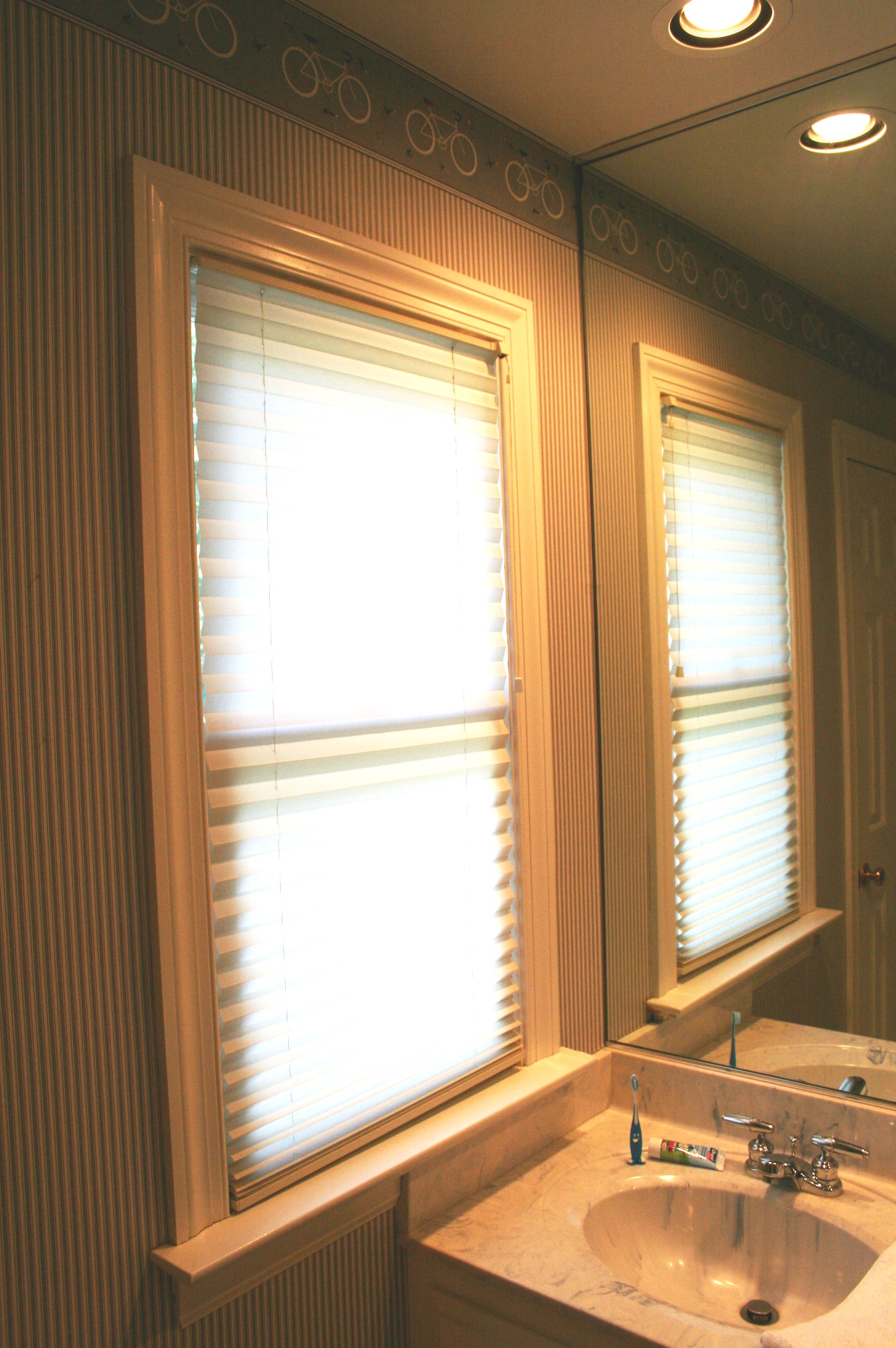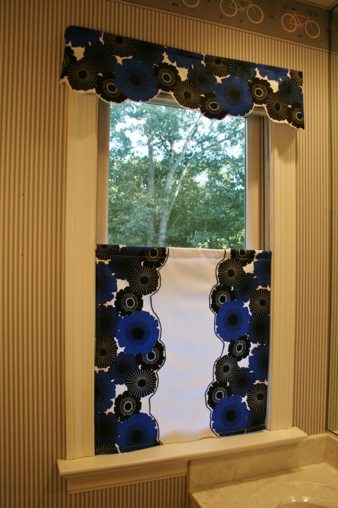 Our upstairs hall bath is definitely on the list for a facelift. The basic footprint is fine, although it sure would be nice if the door did not swing open and into the side of the toilet. Also, because of this odd set up the previous owners put a hole through the back of the door after forcing it beyond the doorstop. Oh well, add that to the list of “fix-ups” around here. Anyway, lately I have been opening the little skinny window in this space because it lets in so much light, benefitting the stairwell and hallway areas. It’s nice to look up and see a bright light showering down. But, this is still a bathroom and we are not exhibitionists here. Well, maybe the toddler is, but that’s another post altogether. In order to enjoy the sunny window, but keep some privacy I decided to add a café curtain and valance. As with the laundry room makeover, you will see me employ this technique for privacy and sun blocking whenever necessary, because unlike frosting a window it still allows a view out should you want or need to see something. I like the idea of frosted glass, but having done so to a bathroom window in the past, I now know how nice it is to actually be able to see out if needed.