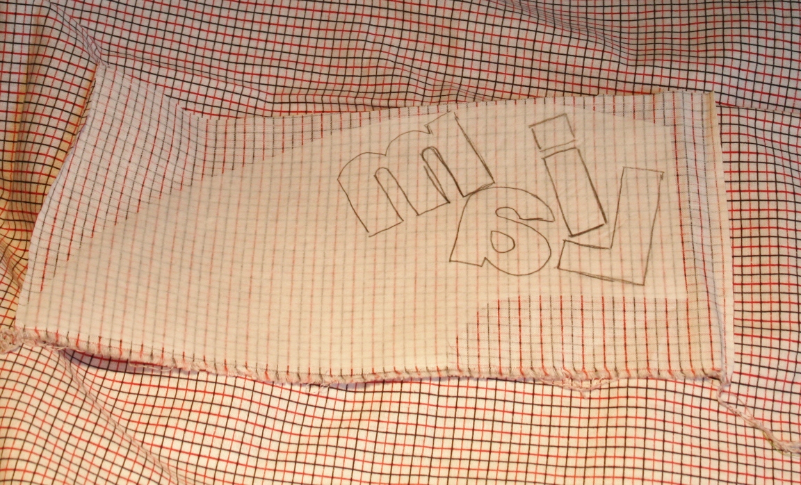 Because the webbing has a paper backing, you can just trace the letter outline directly onto the back of the fabric. To conserve fabric and to switch up the pattern a bit, I shifted each letter before drawing the outline. That way the checkerboard pattern had more play once in place.
