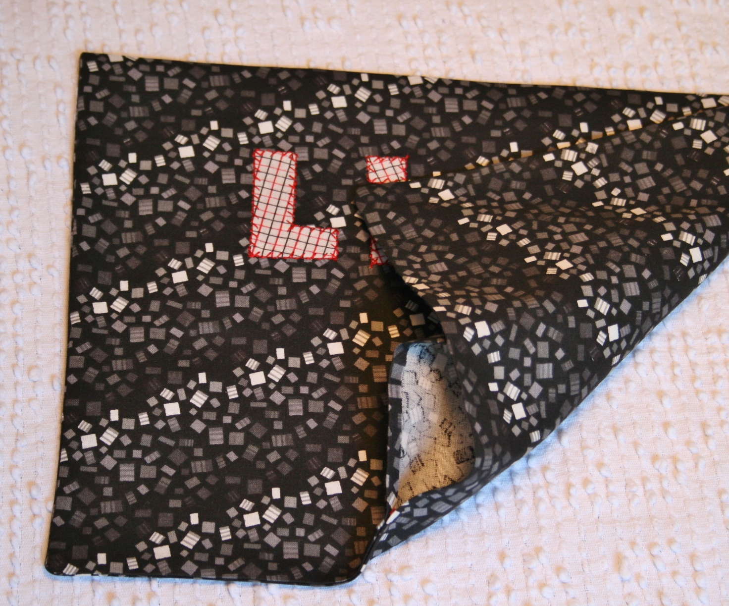 The next step was to cut out each letter and position it on the front of the darker base fabric. The idea here is to cut the base fabric into a rectangle shape, which will be folded in half with the fold at the top edge of the finished pocket. Keep this in mind when positioning the monogram letters. They will need to be close to the middle, but spaced accordingly to allow for the folds and side stitches. I actually folded the rectangle in half so I could get the best layout prior to ironing the letters in place permanently.