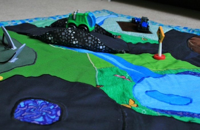 I tried to use different patterns of quilting fabric to give the look and feel of undulating grassy knolls and running water. It’s not perfect, but I think I accomplished getting the jist across. I think this will be one of those things that grows with him as he gets more and more interested in the game of make believe. All that really matters is that my Little Guy is in love with his new toy.