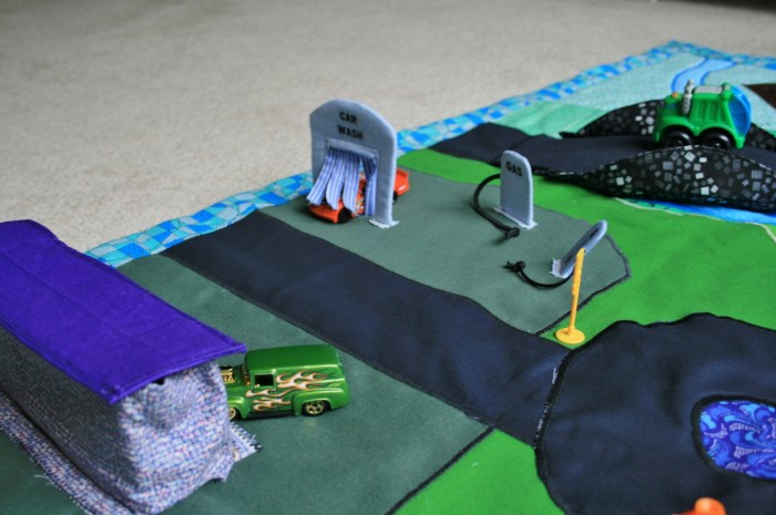 My son’s toy car mat has a small town area with a gas station, including a car wash, and a drive-thru restaurant.