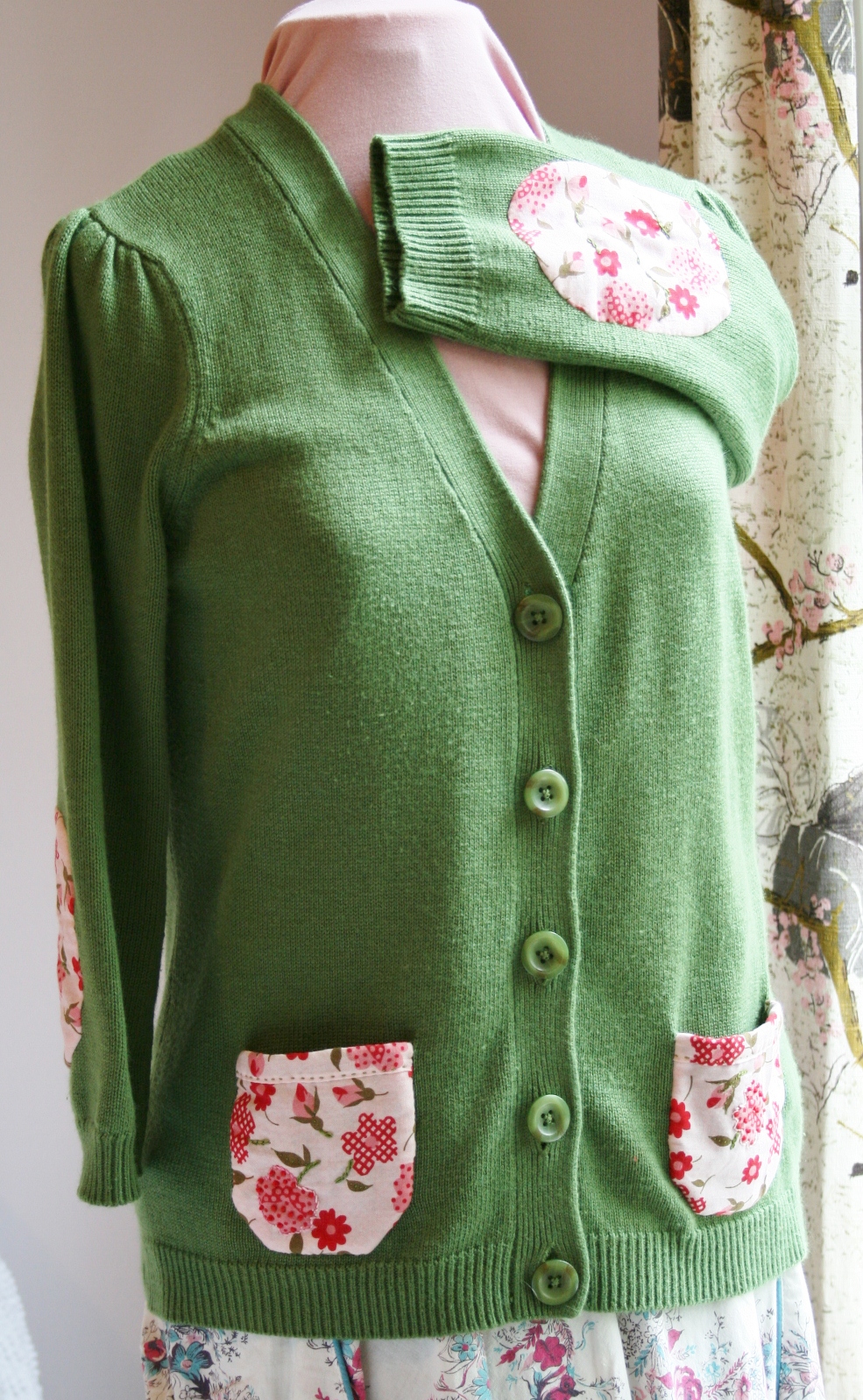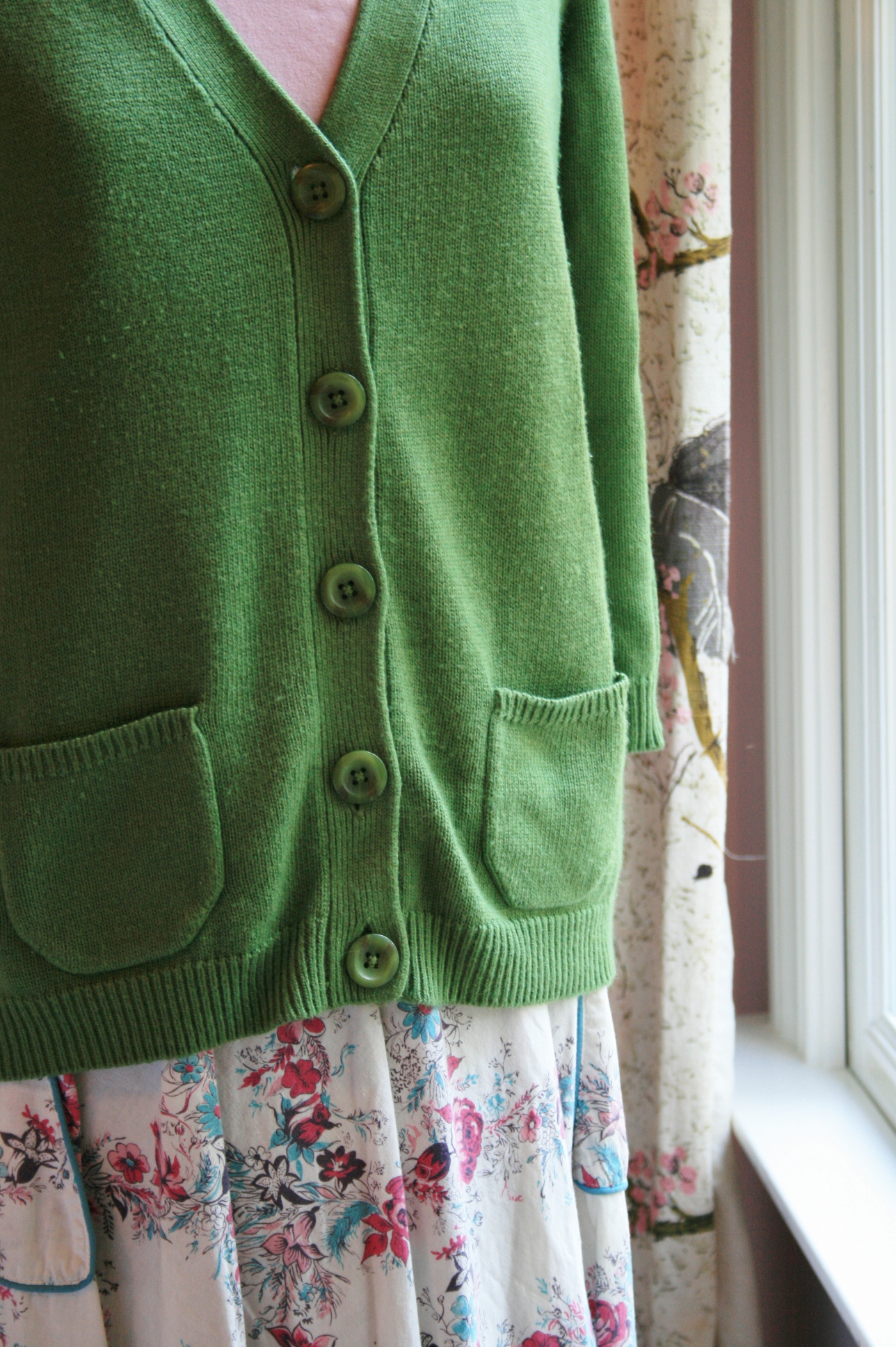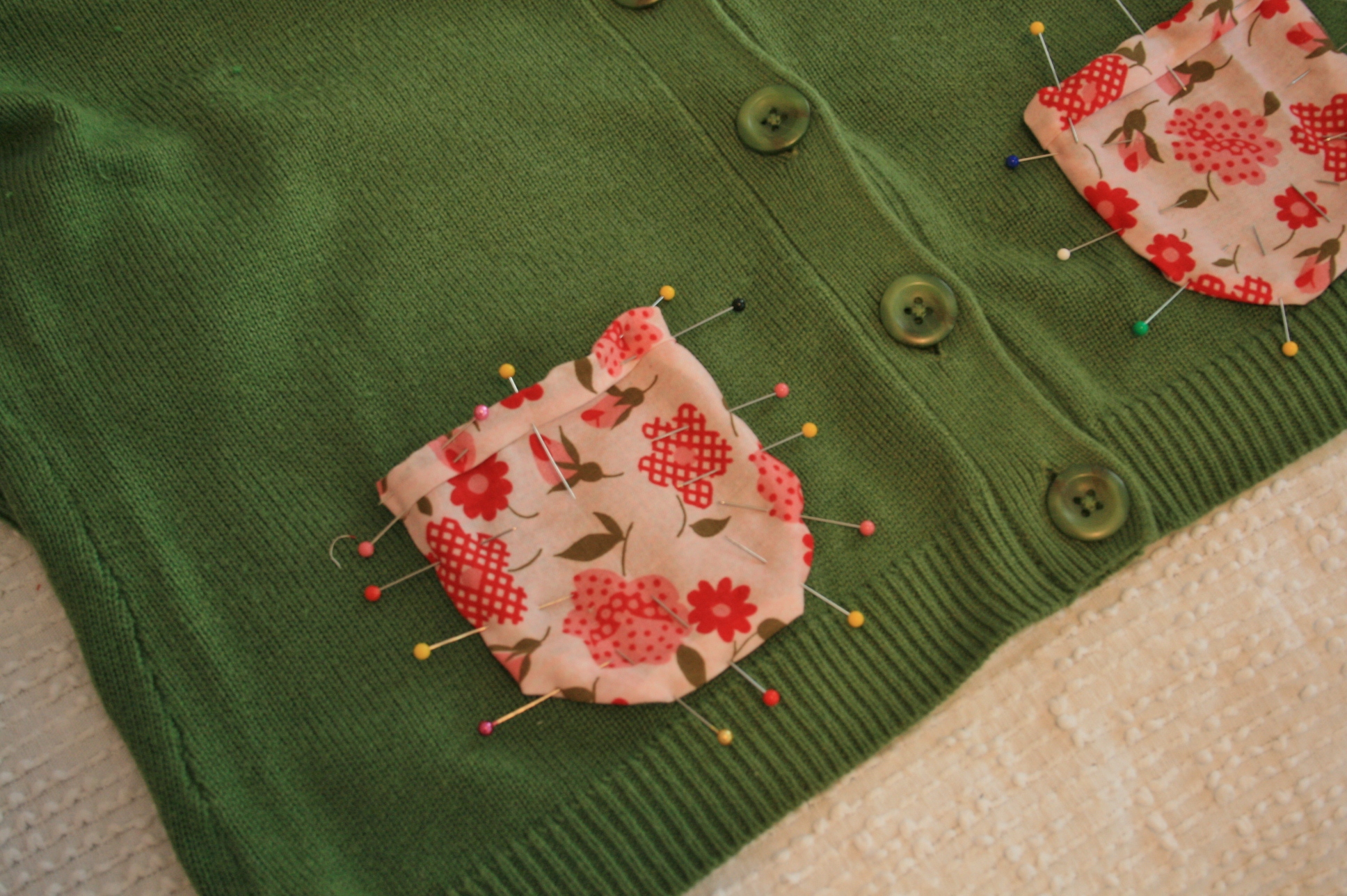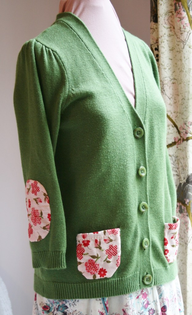 One of my finds at the consignment sale I recently hit up is a dark green Ann Taylor cardigan sweater with three-quarter length sleeves, poofy shoulder seams and patch pockets on the front. While there certainly was nothing at all wrong with this little gem I did decide to give it a tweak or two to make it mine. I think the cheap-o price tag made easy to take a chance on something very different for me. I say different because I don’t normally go for pattern, but this sweater just screamed, “Please add some fun vintage floral fabric to me STAT!” ;o)