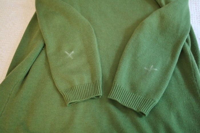 After getting to this point I knew it needed elbow patches, so I put the sweater back on and marked exactly where the point of my elbows hit the sweater (remember this is a three-quarter length sleeve, so they had to go lower than you might think).
