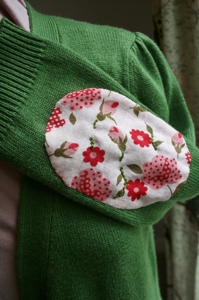 With both the pockets and the elbow patches in place it still seemed that something was missing. So, I decided to get my embroidery on! Not only did this add some dimension and texture, but it also helped to attach the vintage fabric to the sweater. I chose not to use any kind of fusible webbing in this project because I figured it would not adhere well to the sweater material, so I wanted to go a step further to make sure the vintage fabric stayed in place as long as possible. I used a chain stitch to highlight some of the stems and large flowers, plus some french knots to make the polka-dots jump right up from the pattern.