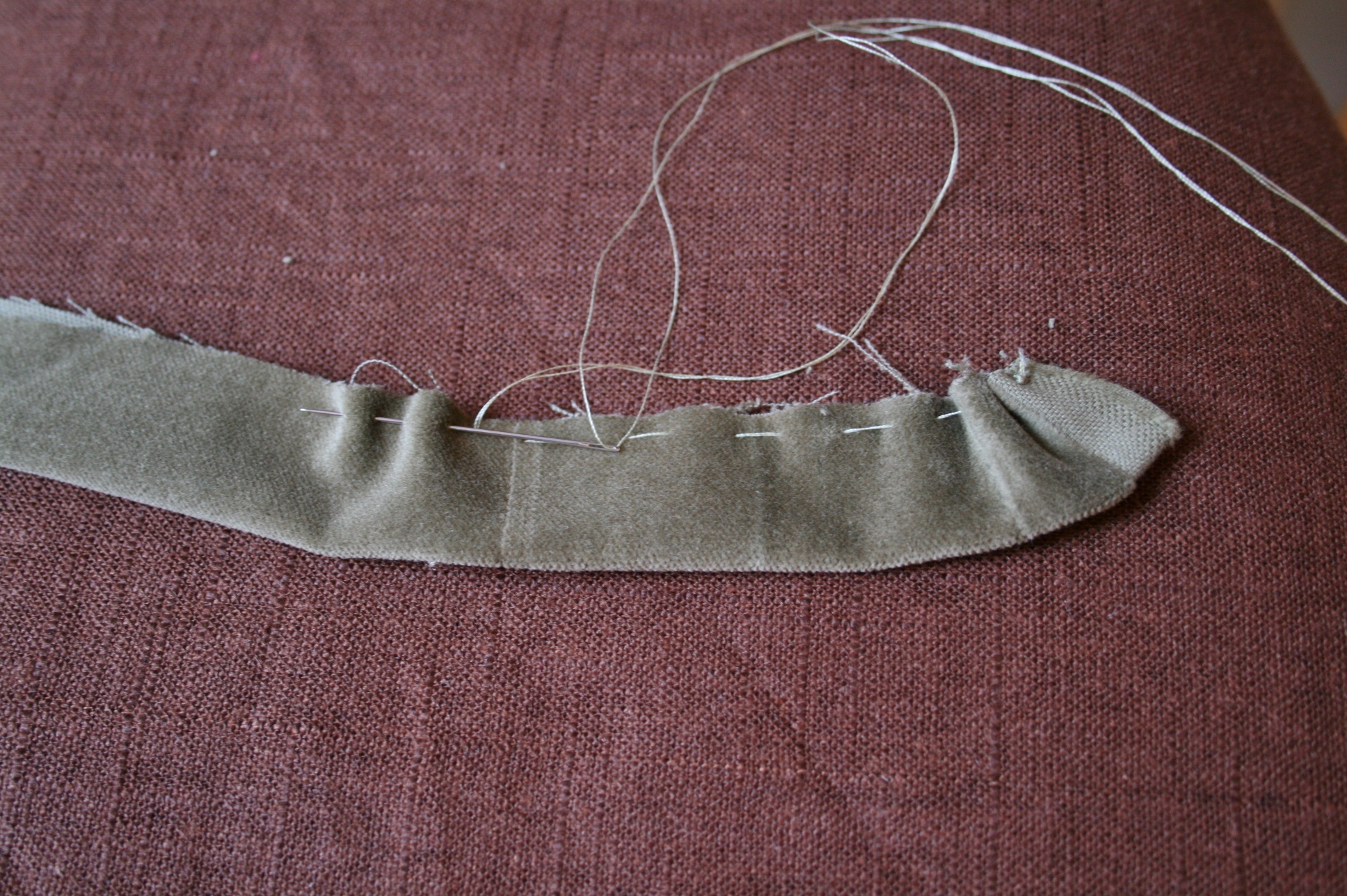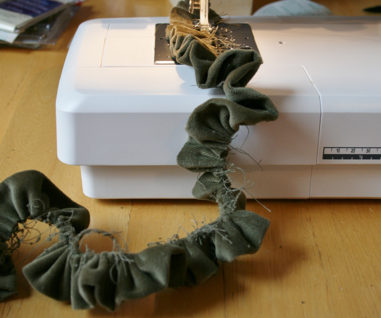 After gathering the fabric as tightly as possible, run a line of stitches along the cut edge to hold the gathers in place. This is also the time to stitch the ends closed and finish them off completely.