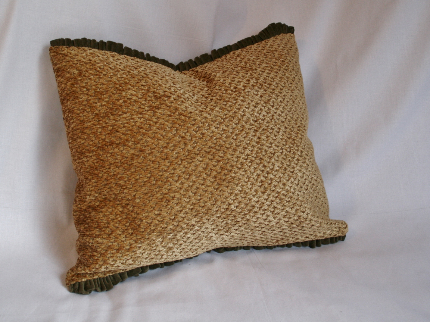 A recent visit to Joann’s ETC., landed a bunch of really nice designer fabric remnant bundles at 50% off. So, I took this as a sign and a que to get started on some much needed family room pillows. Although I was hoping to work in some super fun prints I realized that not knowing what the final wall color will be for this room makes it tough to buy the fabrics of my dreams. Plus, right now I am working with a dark brown leather sofa and a recliner covered in a deeply hued tapestry of browns, black and red. Until we get new furnishings in there I decided to keep things pretty neutral. One of my finds at the fabric sale is a heavily textured camel colored velour type upholstery fabric. I thought it would look nice as a cover for our tired old bolsters. It wasn’t until later that I also discovered that I had enough of this fabric and the accent fabric I found in my stash, to make another set of pillows to go along with new bolsters. Yeah! Here is how I went about creating two ruffle-edged pillows from remnants. First I measured my old, sad looking bolster pillows to get an idea of what size the fabric needed to be, marked the fabric and cut. This is the point when I went, “aha! I can make two more pillows with the rest.”