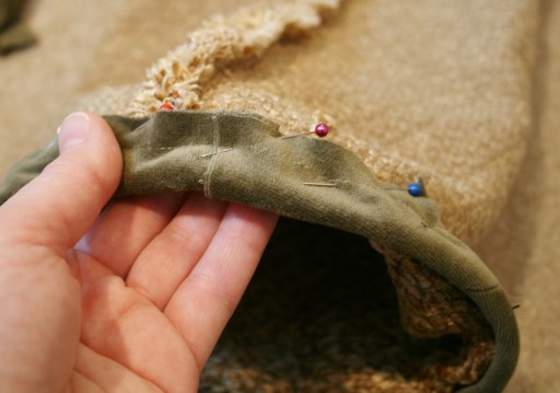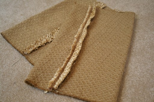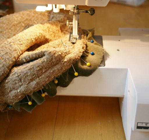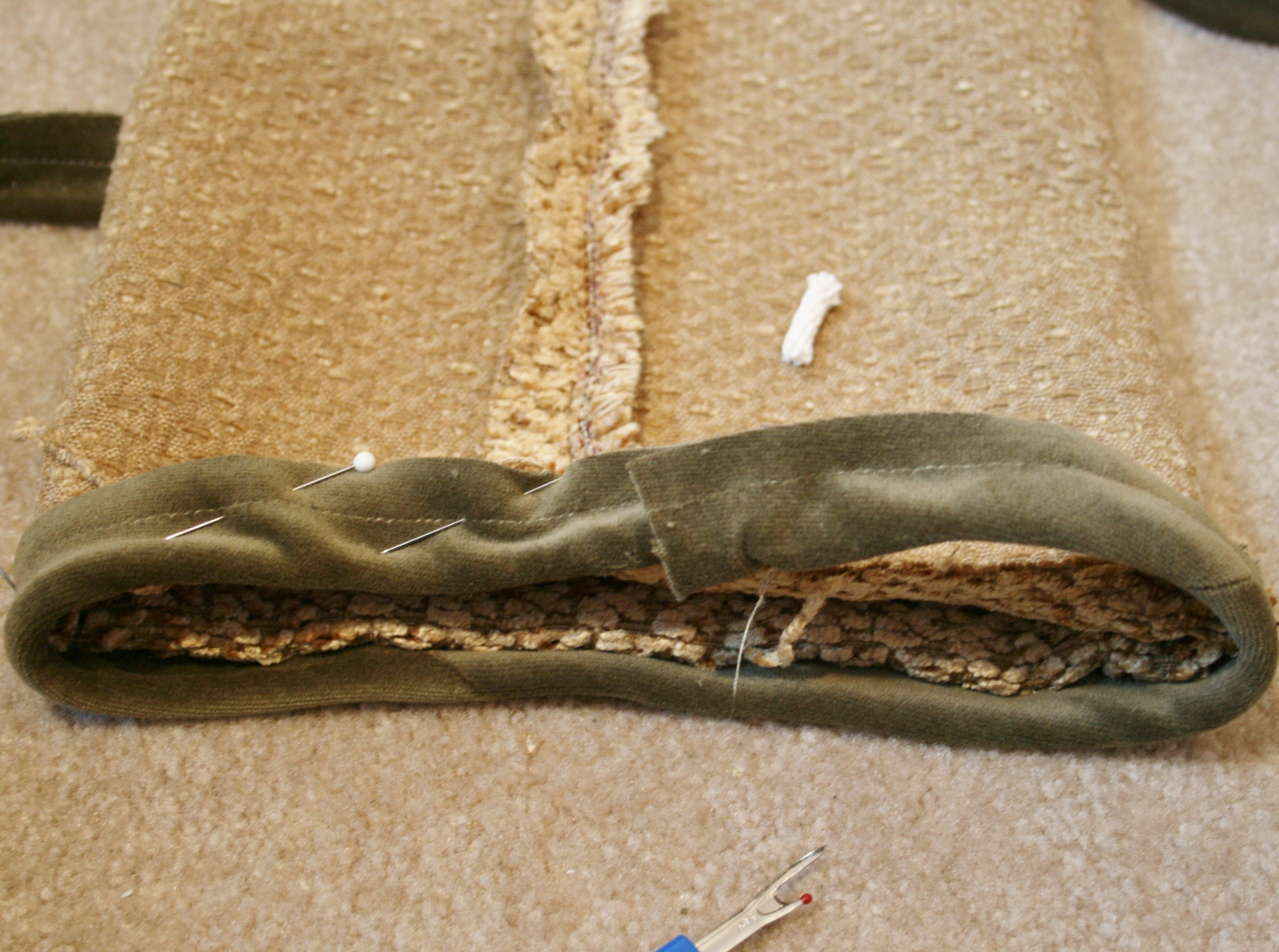 Lucky for me I had enough leftover velveteen to cut the necessary strips to create matching trim for both pillows. I won’t go into detail about making piping because a quick Google search will bring up more tutorials than you could possibly ever need. After I stitched up a nice long length of the piping I started pinning it into place along the open edge of the bolster end.