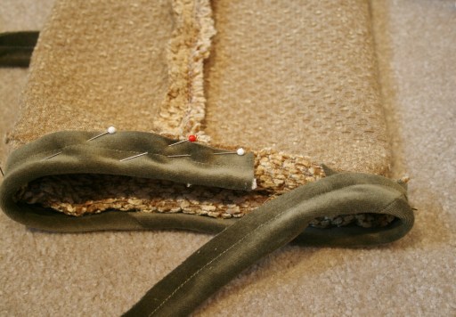 At this point you should have closed the gap on the piping strip needed for the end of the bolster. Pin everything into place and stitch the piping to the bolster end.