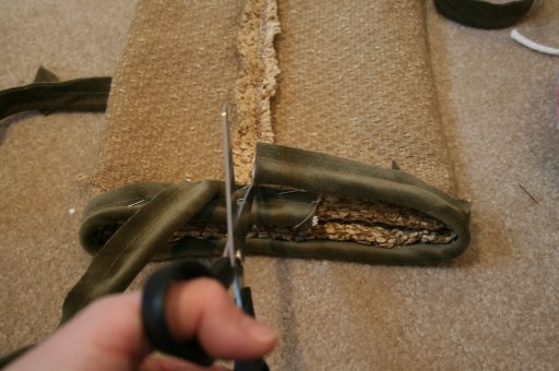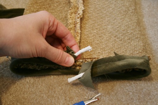 Next, pull back the fabric along the piping insert at the beginning of the strand of piping and cut away about 1.25 inches of the inner cording.