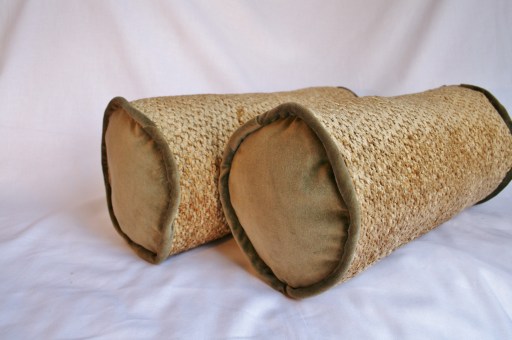 As you all read last week, I scored some nice designer remnant upholstery fabrics a few weeks ago at Joann’s for a song and have been diligently making new pillows to spruce up our family room. I already showed off the simple envelop style pillows I created with a heavy ruffled edge, now I wanted to share the bolsters I made.