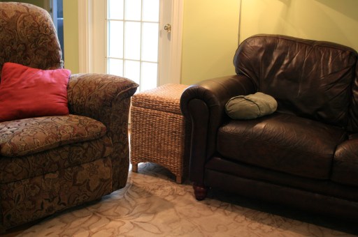 While taking pictures during a furniture switcheroo over at my other blog, www.kitschdesigns.com, I had to admit to myself that our family room pillows were anything but inviting. They looked like someone had chewed them up, spit them out and then tied them to a bumper to be dragged around outside for a while. This room gets a lot of use and those pillows are constantly being smooshed into all different configurations for comfort. Unfortunately all that mashing had twisted them into new shapes that were a mere shadow of what they once were.