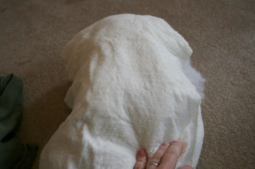 After cutting the batting down to size, I opened it and began laying out a thick layer of stuffing along one half of the length of batting.