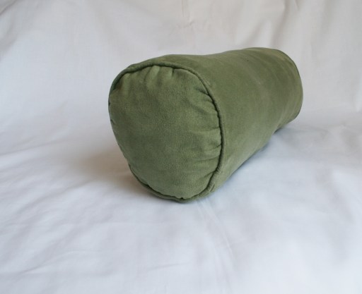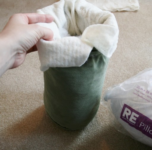 This next step is probably the trickiest part of the whole process. Taking the folded end of the batting and stuffing “sandwich” do your best to sort of roll the batting and sides down and together, essentially creating a cylinder type shape. Grasping the folded end with one hand and doing your best not to compact everything, begin stuffing the bolster cover. Keeping your hand on the folded end of the stuffing “sandwich” pull it to the bottom of the bolster cover.
