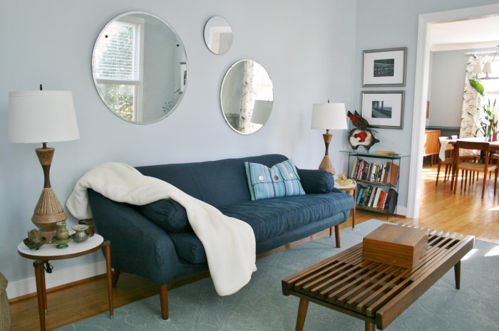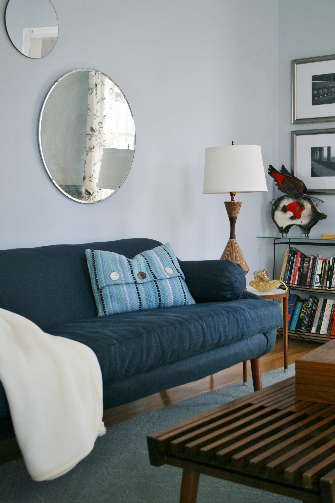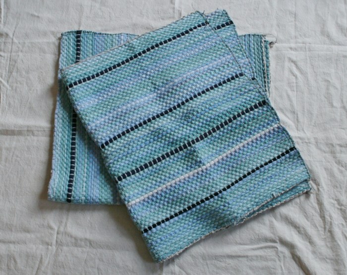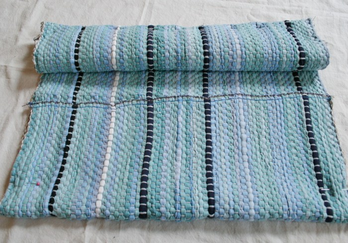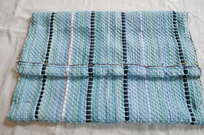 Among the neat items were a couple of pillows that caught my eye.  My first thought was that they were sort of beachy and would look great in a vacation home.  (That might also be due to the fact that I had been shopping rentals for our upcoming vacation.)  My next thought was that they might be just the right thing for a spring/summer mix-up in our formal living room.  Several days later I just happened to notice two, seemingly unused, rag rugs in shades of blue at our local Sal. Army store.  For $1.99 I brought them home and started the process of freshening up the place.  I decided to make simple envelope style pillow covers.
