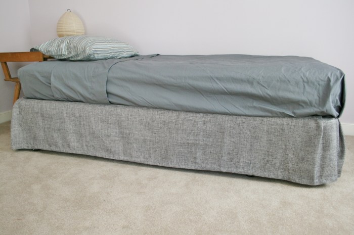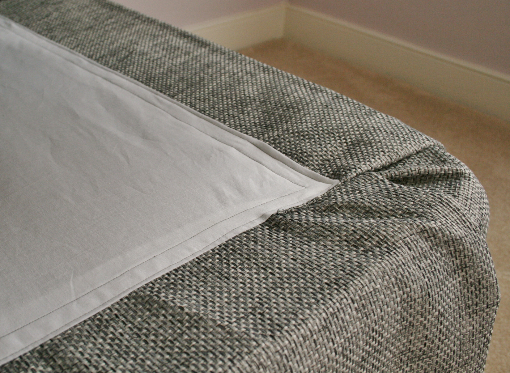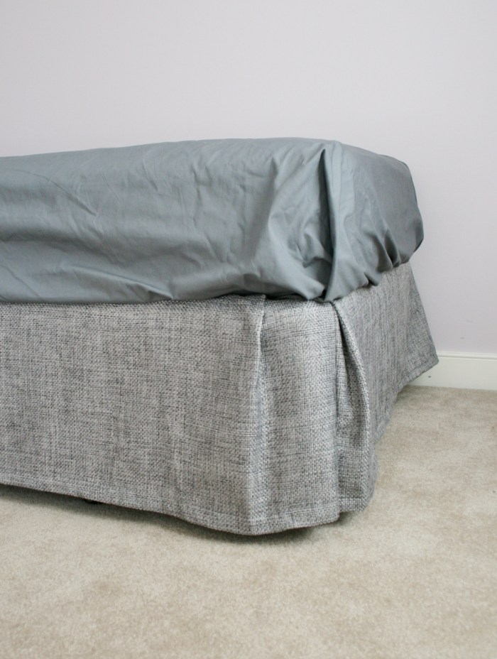 The next part was probably the most daunting simply because I had to pin the utility cotton along the edges of the curtain panel fabric, remove the whole thing and stitch it into place without shifting the edges or the pleats. I started by running a stitch along the edge to connect all the pieces, then I put the whole thing back in place along the box springs to be sure the skirt hung correctly.